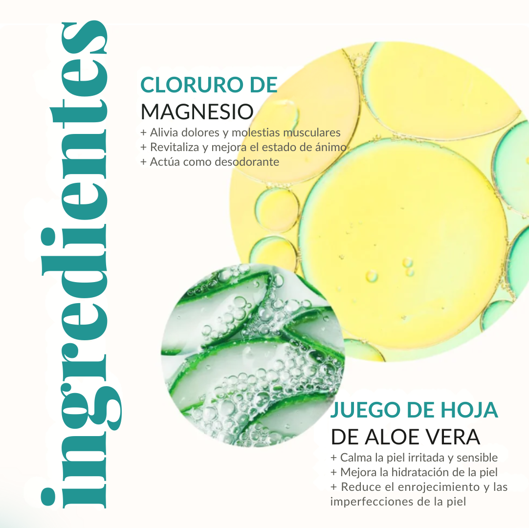 Ingredientes clave: Cloruro de Magnesio, Jugo de Hoja de Aloe Vera, Agua Purificada